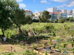 A Horta Solidária e Comunitária da Quinta da Presa está localizada na Serra das Minas, combinando uma paisagem que envolve espaços verdes, prédios e a linha do comboio suburbano (Imagem: João Pedro Costa, 2025)