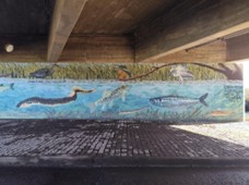 Mural representativo da biodiversidade local, incluindo espécies como o guarda-rios ou a enguia-europeia.
