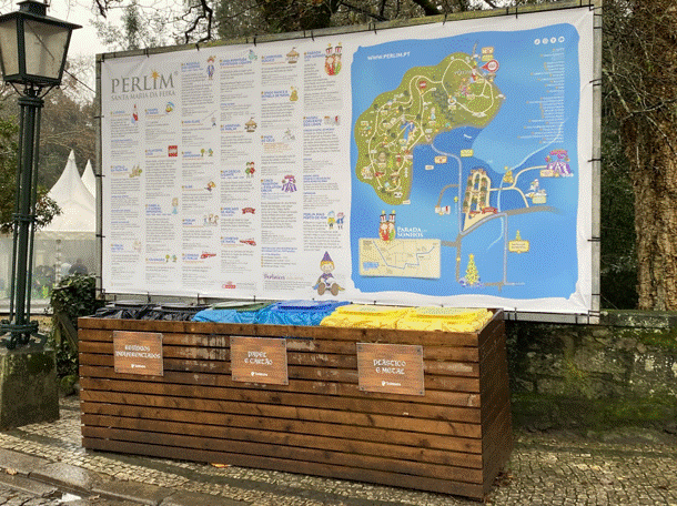 Contentores de reciclagem no Perlim mostram a preocupação com a gestão do lixo e a preservação do espaço público. No entanto, a falta de um ecoponto verde no local dificulta a reciclagem de vidro.